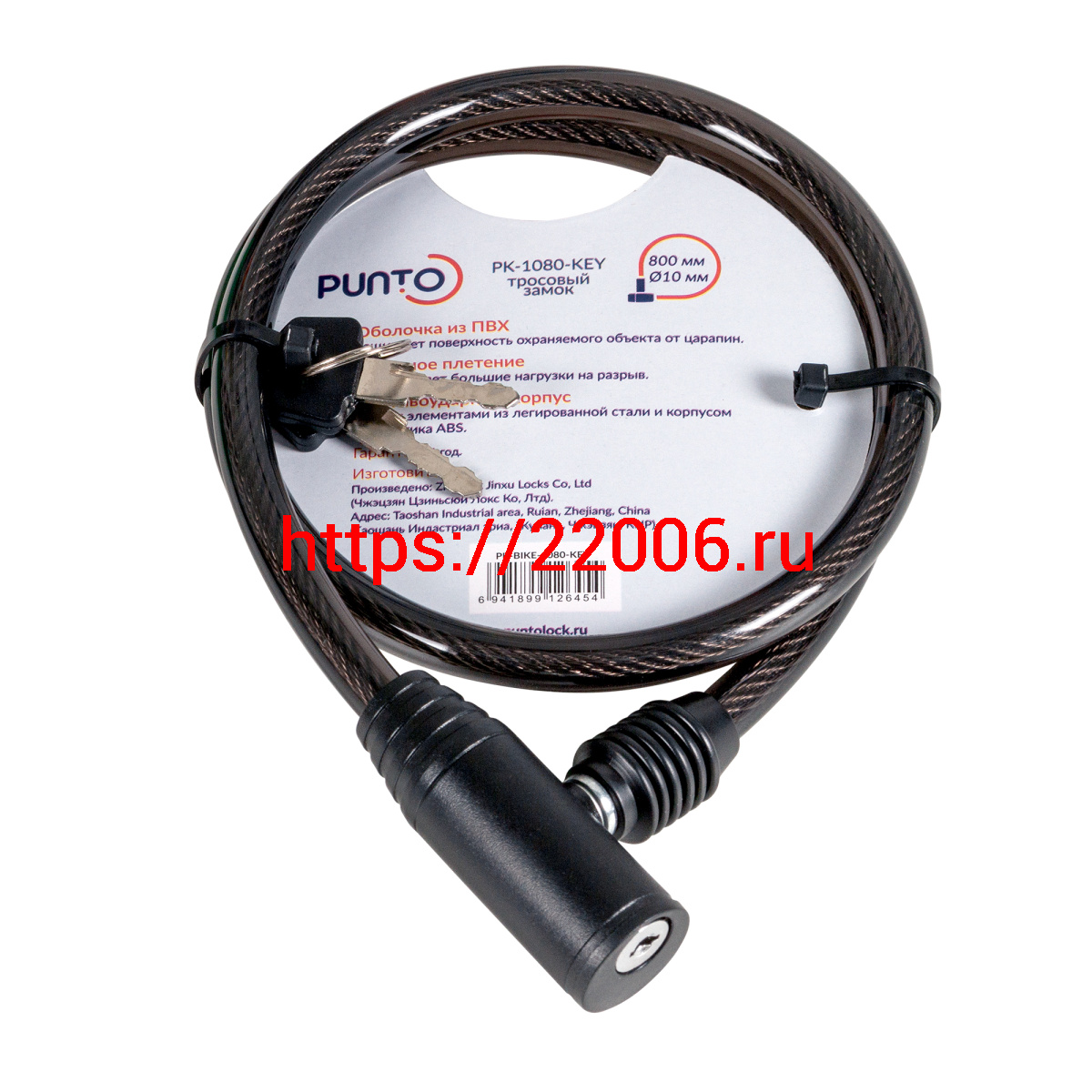 - Замок Punto (Пунто) тросовый PK-BIKE-1080-KEY (10х800) 2key/подвес в Екатеринбурге недорого